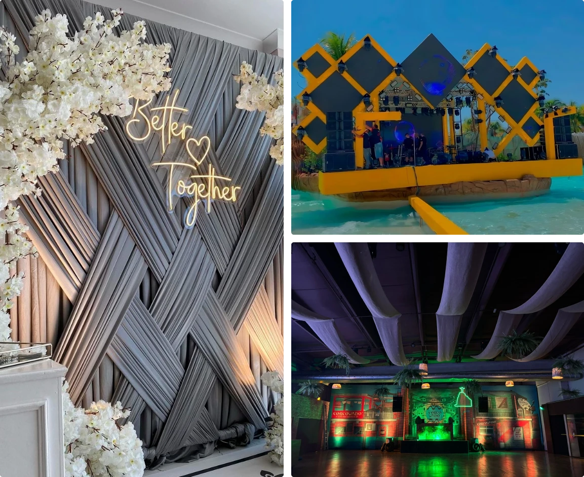 Atendemos produtoras de eventos, agências e casas de espetáculo que buscam diferenciação e impacto visual. Nosso compromisso é entregar projetos personalizados que valorizam cada evento, garantindo sofisticação, funcionalidade e exclusividade.