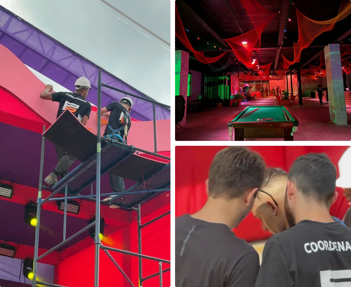 Em eventos como festas, shows, e festivais, cada detalhe conta — e a cenografia faz toda a diferença na experiência do público. A PB Produções é especialista em transformar espaços com revestimentos em lycra, totens personalizados e ambientação completa.